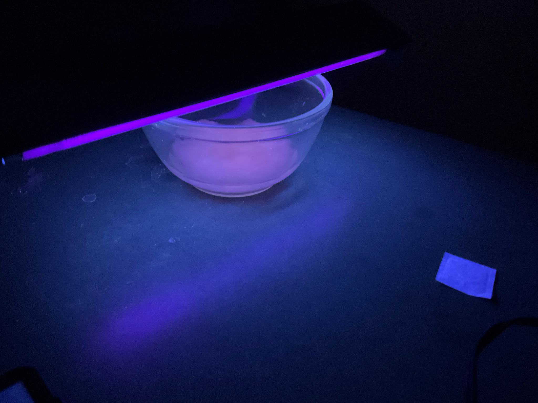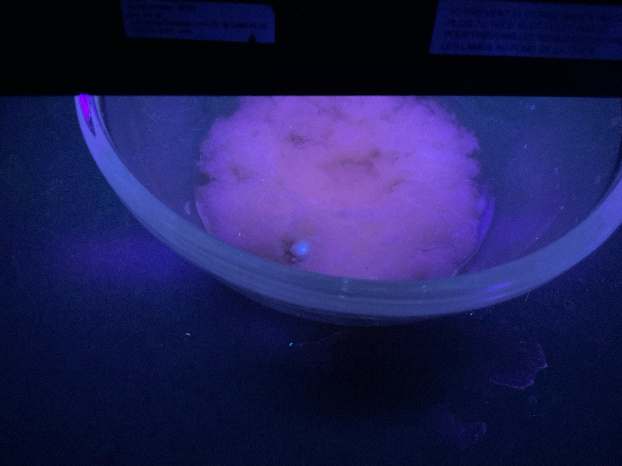 As you can see above, the cotton fibers glowed a faint pink or white under the UV or black light. I decided to use this glow in the chlorophyll or film. The glow would occur when the electrons were excited by the frequency emitted under black light.