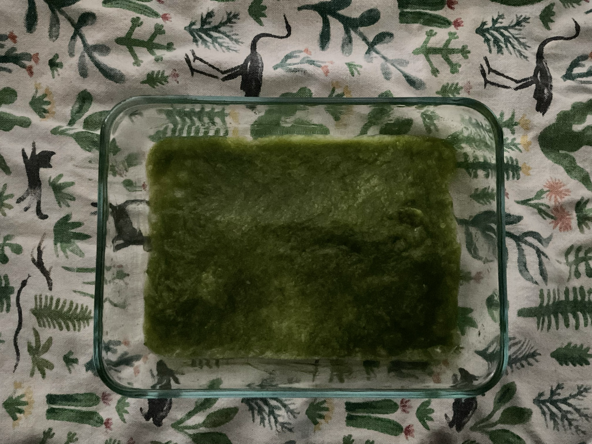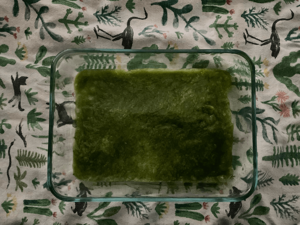 I cleaned the 100 % cotton by washing it in lemon juice or hydrogen peroxide. Then I boiled it in dechlorinated water. I wanted to make the fibers translucent, but the closest I got was to whiten the fibers or cellulose. To whiten the fibers, I needed sunlight or a UV light source. So, I used a black light I had lying around from another art project. At this step, I noticed the extracted chlorophyll residue on the counter.