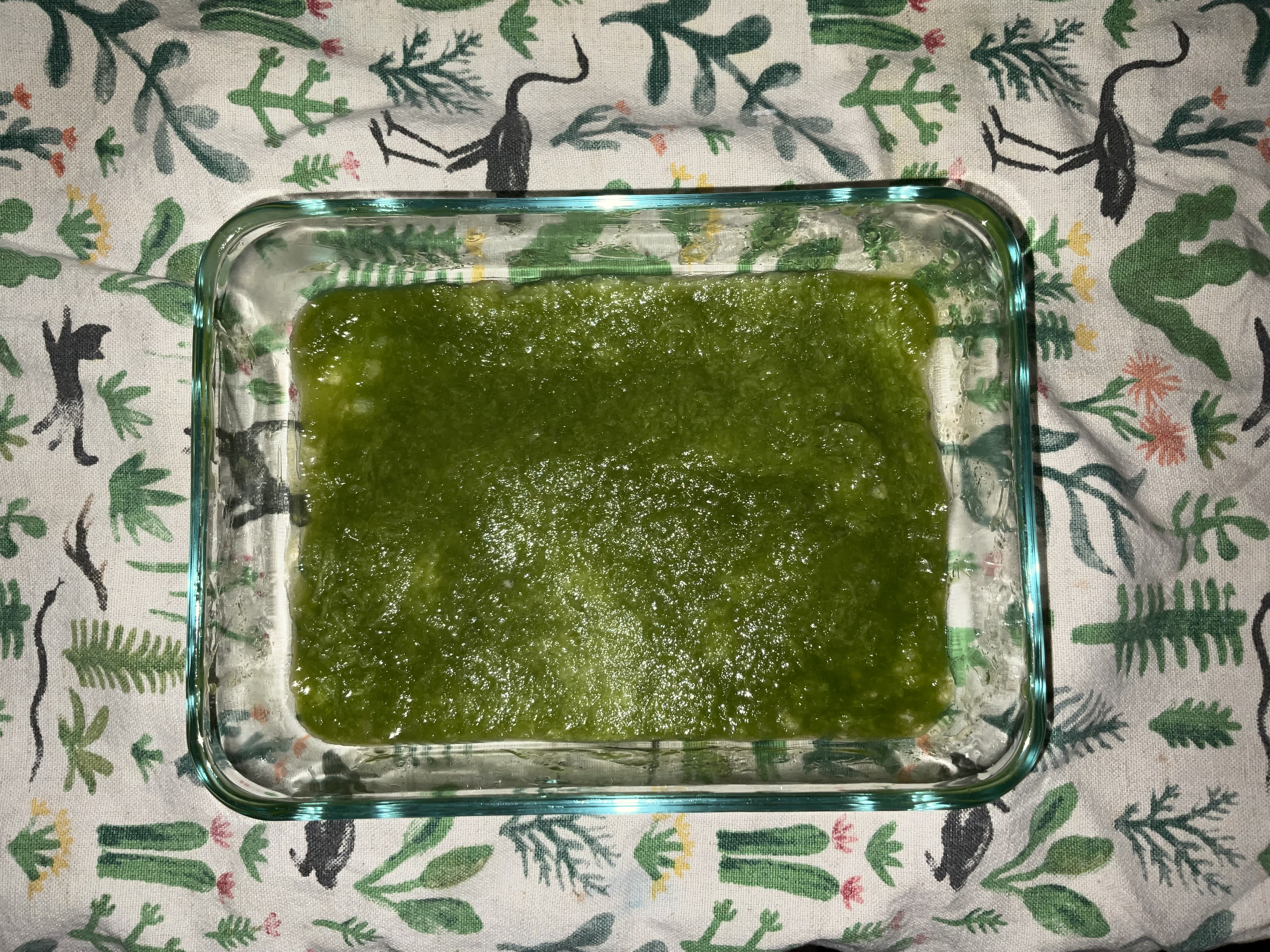 3- Blend the mix more and strain off the pulp using the sieve or coffee filter. Keep the green liquid. This is the chlorophyll.